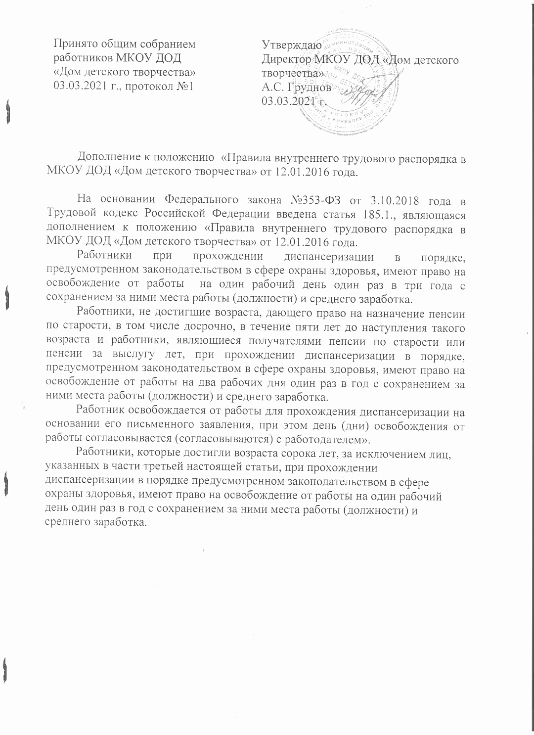 Дополнение к положению «Правила внутреннего трудового распорядка в МКОУ ДОД «Дом детского творчества» от 12.01.2016 года.