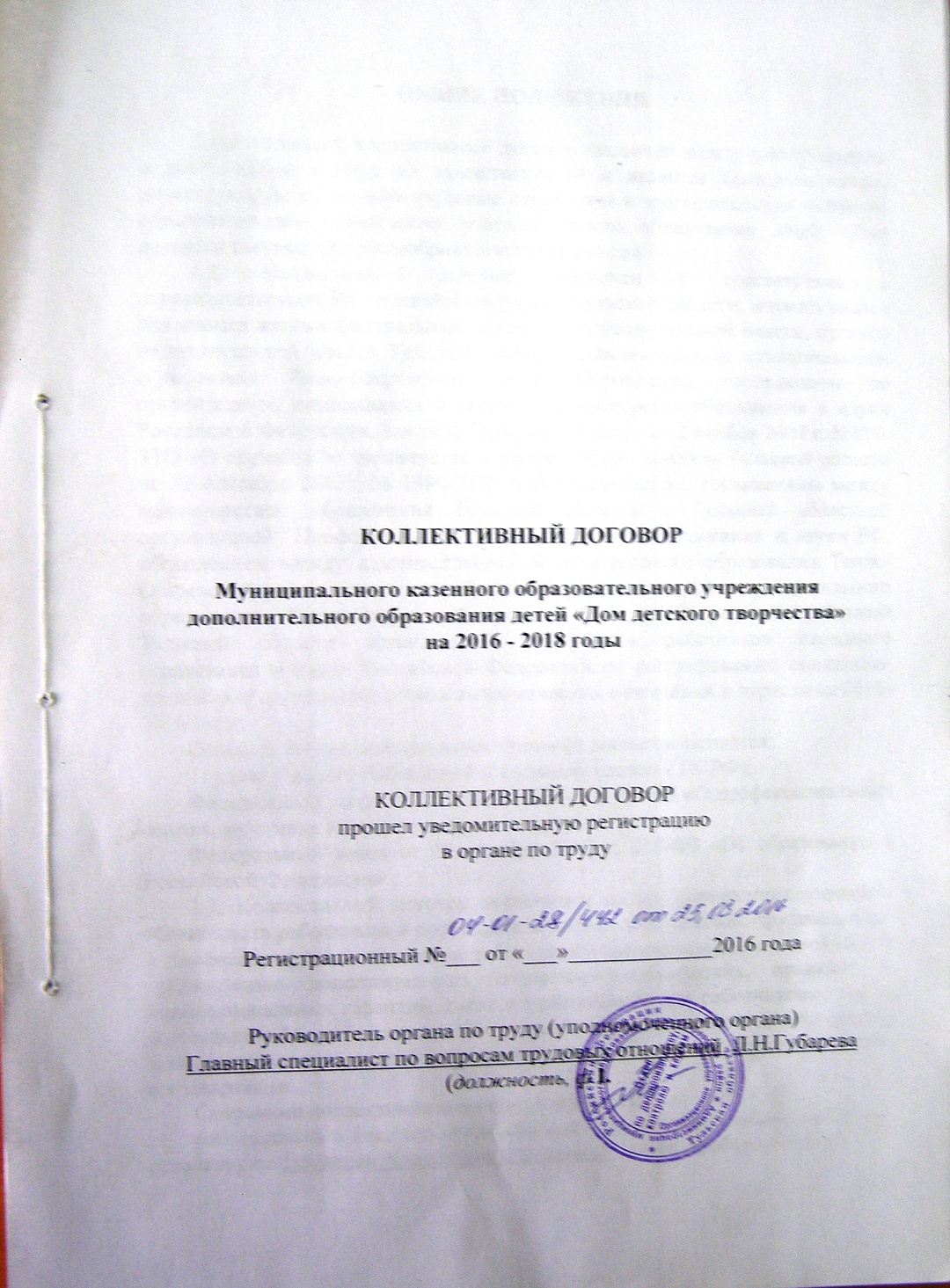 Коллективный договор Муниципального казенного образовательного учреждения дополнительного образования детей «Дом детского творчества» на 2016 - 2018 годы